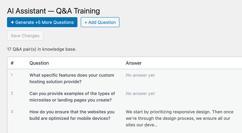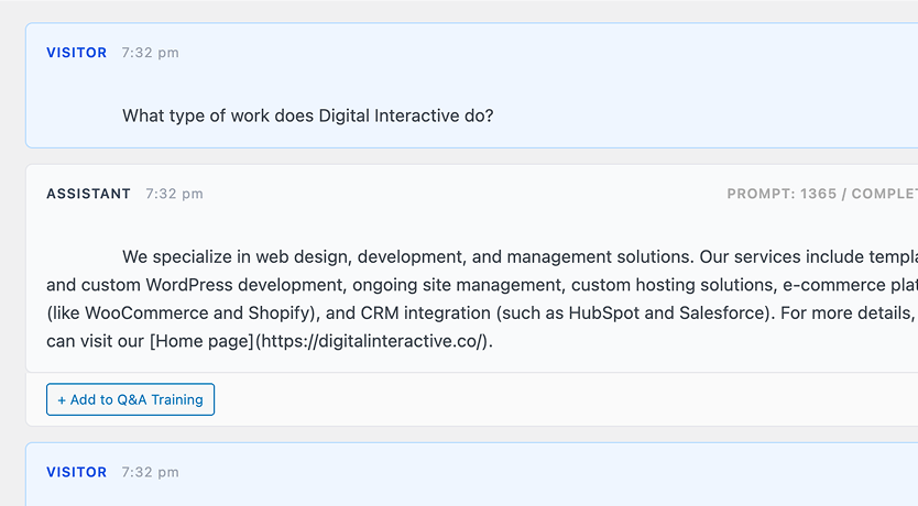 Your AI assistant is trained using your website’s actual content, including pages, posts, and any custom information you provide. It doesn’t pull random answers from the internet – it uses your site as its primary source to ensure accurate, on-brand responses.